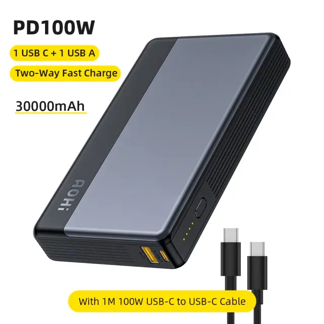 Современный, стильный powerbank, в тонком корпусе, оснащенный тремя портами, два из которых выдают зарядку мощностью от 100 Вт и более.