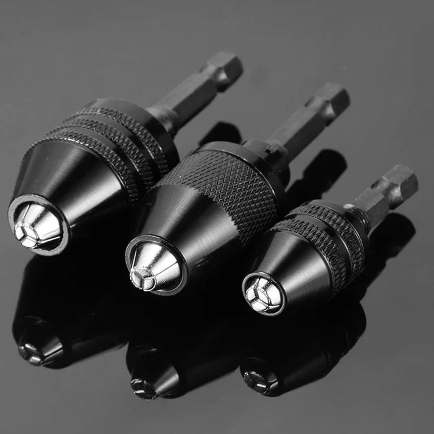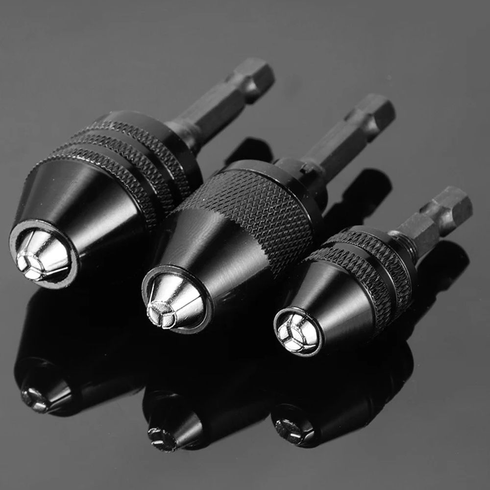 Кстати, если ваш шуруповерт, обычный или ударный, имеет возможность установки расходных аксессуаров только с шестигранным хвостовиком, то стоит приобрести данный адаптер. Зажимной кулачковый патрон хорошо держит обычные сверла (подойдет и для фрез, которые описаны выше). На выбор три варианта разного размера.