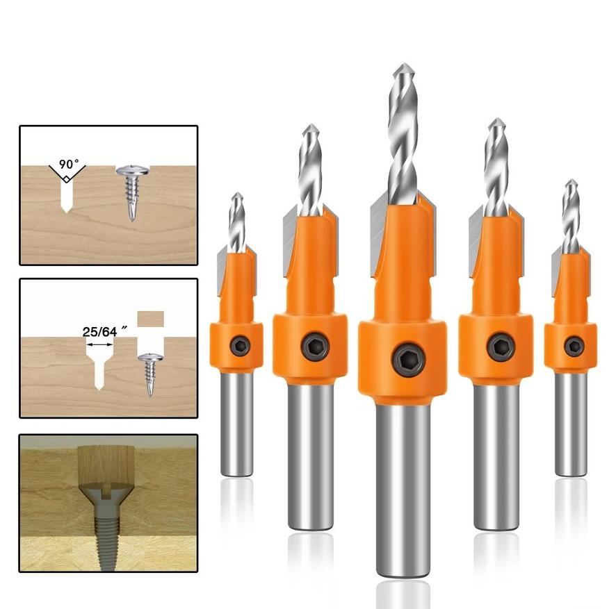 Один из моих любимых вариантов продвинутых сверл с адаптером для скрытия крепежных отверстий. Отлично подходят для выполнения мебельных и бытовых работ, чтобы крепеж был не виден с внешней стороны изделия. Сначала обычное сверло выполняет засверловочное отверстие, затем в работу вступает адаптер который углубляется в материал и имеет ширину равную головке шурупа. После того как крепежный элемент установлен сверху его можно закрыть деревянным штапиком и шлифануть. Если не углублять адаптер сильно в материал, то можно сделать простую зенковку, чтобы шляпка самореза была заподлицо с поверхностью. Можно приобрести как поштучно, так и набором.