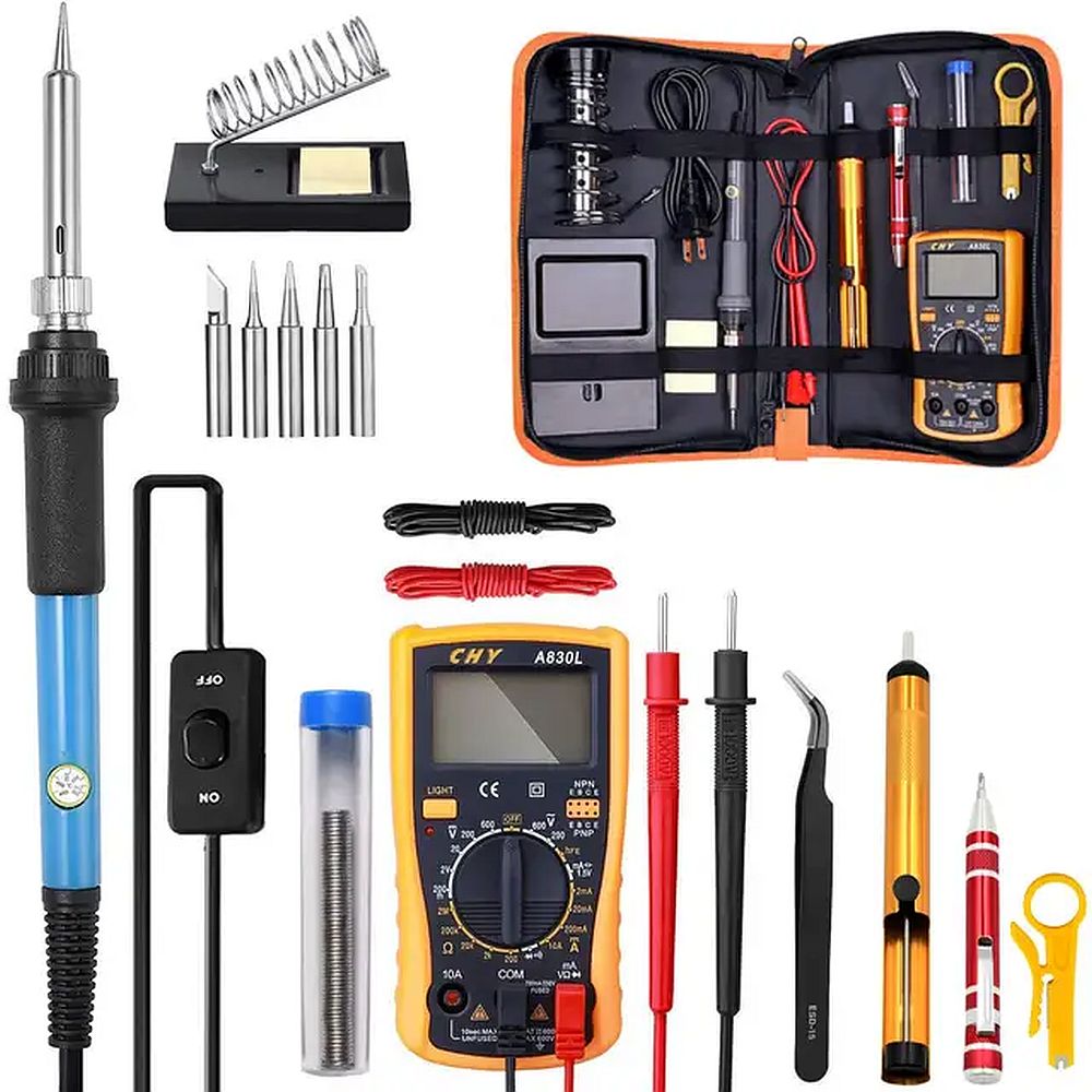Не во всех случаях скрутка и клеммы являются лучшим способом соединения и тогда просто не обойтись без пайки соединений электрического провода. Паяльник является незаменимой вещью для любого домашнего мастера. Для бытового и частного использования, не обязательно покупать сложную и дорогую модель, оптимальным выбором может стать набор «все-в-одном». В состав комплекта входят все, что необходимо для выполнения комфортной надежной пайки: паяльник с регулировкой температуры жала и дисплеем, припой, подставка, сменные жала, пинцет, небольшой мультиметр. Весь набор поставляется в кейсе на молнии. Мощность паяльника составляет 60Вт, этого вполне достаточно для любых домашних задач.