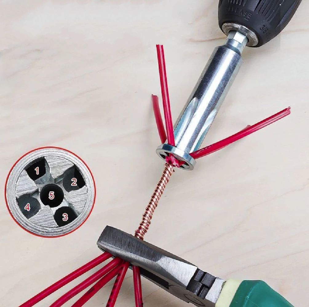 После нарезки провода и удаления изоляции изоляции их нужно из соединить. Способов соединения весьма много, одним из них является плотная скрутка проводов. Скрутить можно вручную, если сечение соединяемых проводов небольшое, однако, если это так, то можно воспользоваться специальным приспособлением. Данная штучка может и снять изоляцию и аккуратно сделать надежную скрутку из нескольких проводников. Инструмент выполнен в двух вариантах: для скрутки вручную приспособлены выступающие рукоятки, а вторая версия предназначена для использования совместно с шуруповертом. Таким способом можно соединить от двух до пяти проводов одновременно. Хотя и заявлено, что приспособление может удалять изоляцию, я бы рекомендовал делать это заранее, а провода скручивать уже без оплетки.