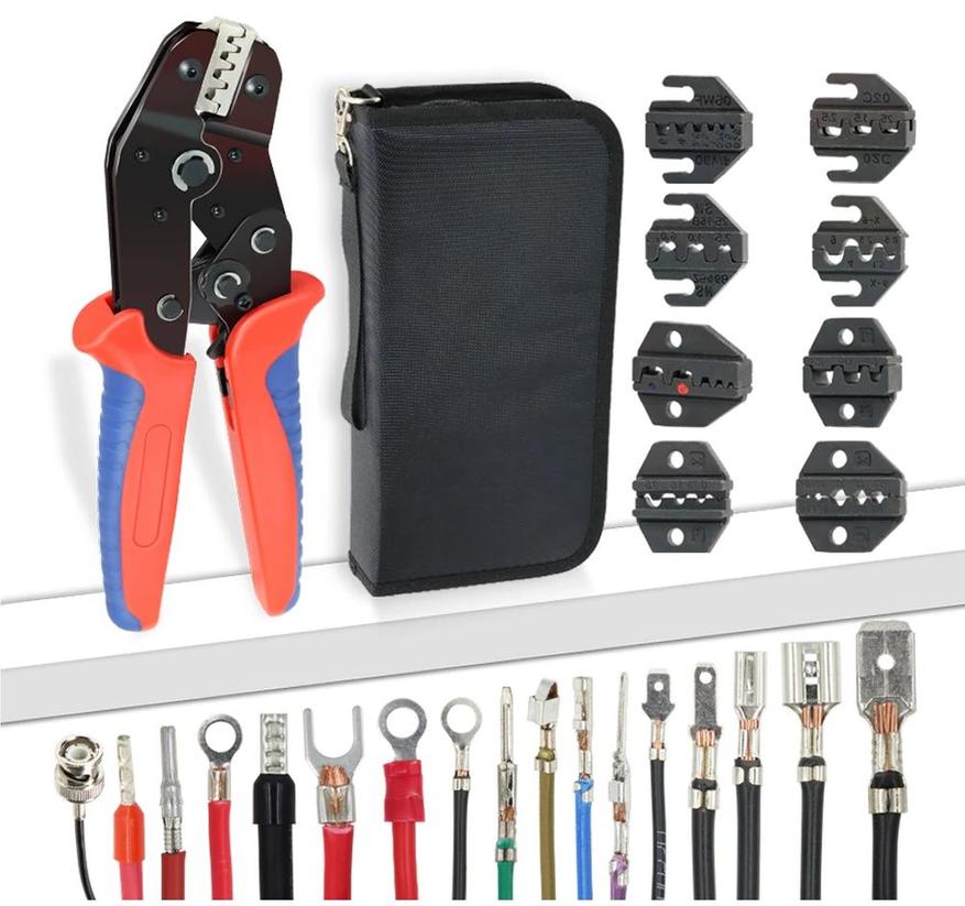 При ремонте разных электрических устройств часто может потребоваться заменить отгоревшую или отломившуюся на конце электрического провода клемму определенной формы. Вариантов и форм таких клемм и терминалов достаточно много, также они отличаются по толщине провода на который устанавливаются и способу фиксации. Для их установки можно воспользоваться универсальными обжимными клещами, как раз и предназначенными для их правильной установки. Инструмент имеет сменные матрицы обжима, которые меняются под тот или иной тип клемм. На странице товара представлены различные наборы с разным количеством сменных матриц.