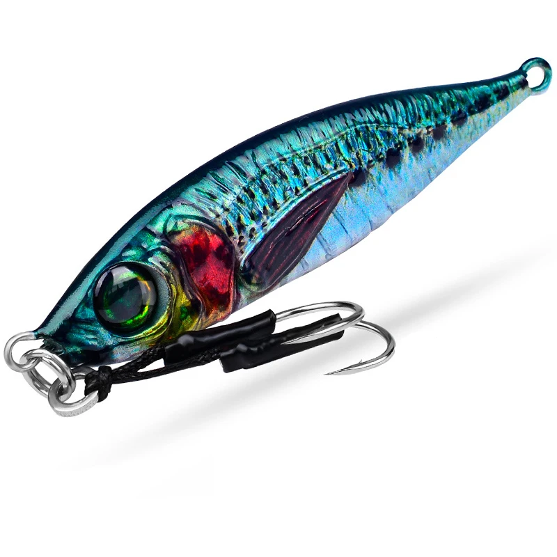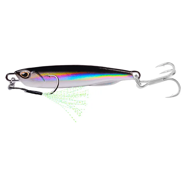 Это металлическая джиг-приманка формата slow jig. Корпус компактный, утолщенный в центральной части, с выраженной геометрией, которая задает колебания при опускании. Вес варьируется от 7 до 80 г, что покрывает как легкий береговой заброс, так и более глубокую или морскую ловлю. По изображениям видно голографическое покрытие с переливами и имитацией чешуи, а также крупные 3D-глаза. Оснащение — двойной ассист-крючок на шнуре, закрепленный через силовое кольцо. Приманка не имеет встроенных подвижных элементов, вся работа формируется за счет формы, центра тяжести и веса. Доступно 8 вариантов расцветок.
