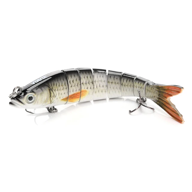 Это составной жесткий воблер (swimbait), выполненный из сегментов, соединенных между собой, за счет чего тело изгибается и формирует S-образное движение. В зависимости от версии используется 6, 7 или 8 сегментов, длина варьируется примерно от 10 до 14 см, вес от 8,7 до 26 граммов. Корпус из ABS-пластика, внутри размещены металлические шарики, которые участвуют в балансировке и создают звук. Приманка тонущая, оснащена двумя тройниками, выполненными из высокоуглеродистой стали. Внешне реализована имитация рыбы: объемное тело, 3D-глаза, отражающее покрытие. Доступно более 50 вариантов расцветок. Если сравнивать с предыдущими приманками, это уже третий уровень по конструкции. По отношению к MEREDITH Easy Shiner разница очевидная: там мягкий силикон с гибким хвостом и простой геометрией, здесь жесткая многосоставная приманка с подвижным телом. По сравнению с AOrace Minnow — оба варианта жесткие, но Minnow цельный корпус и работает за счет лопатки и колебаний, а VTAVTA именно сегментирован и двигается всем телом. С Tanta различие максимальное: силиконовый червь против крупной жесткой приманки с выраженной механикой движения и большим весом.
