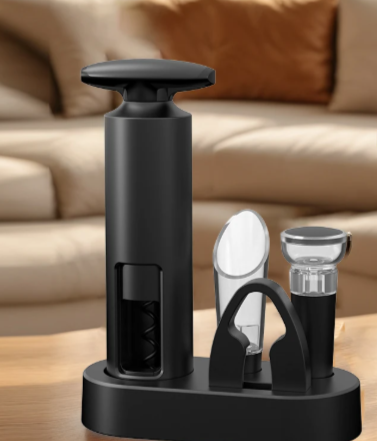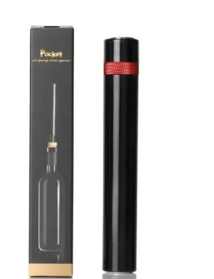 Портативный воздушный штопор включает металлическую иглу и насос. Игла вставляется в центр пробки, после чего несколько накачиваний воздуха позволяют безопасно удалить пробку.