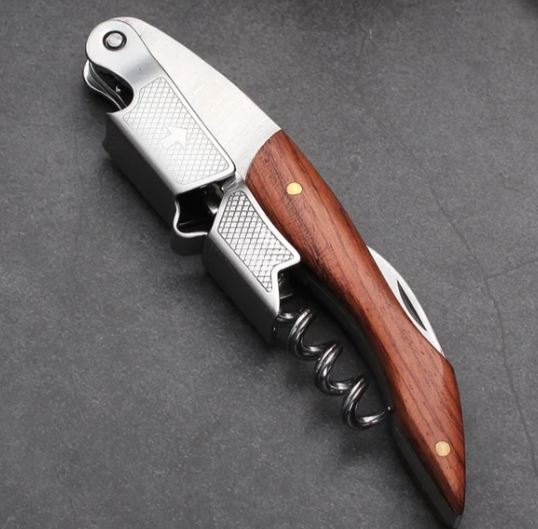 Многофункциональный штопор выполнен из нержавеющей стали с деревянной ручкой коричневого цвета. Встроенный нож позволяет аккуратно снимать фольгу с горлышка бутылки перед извлечением пробки.