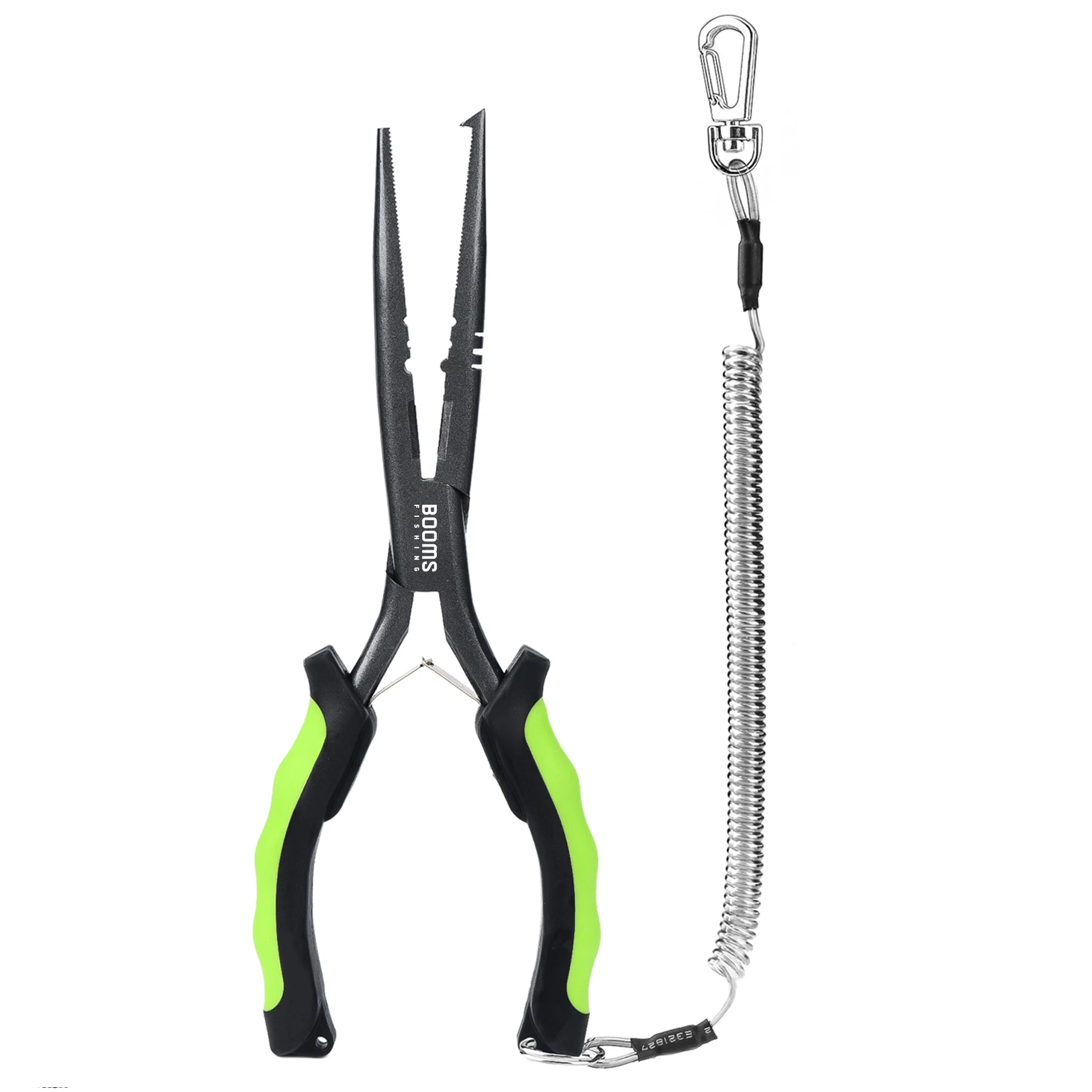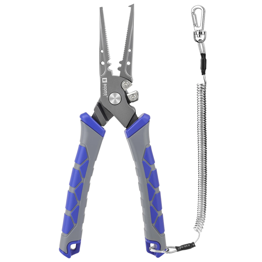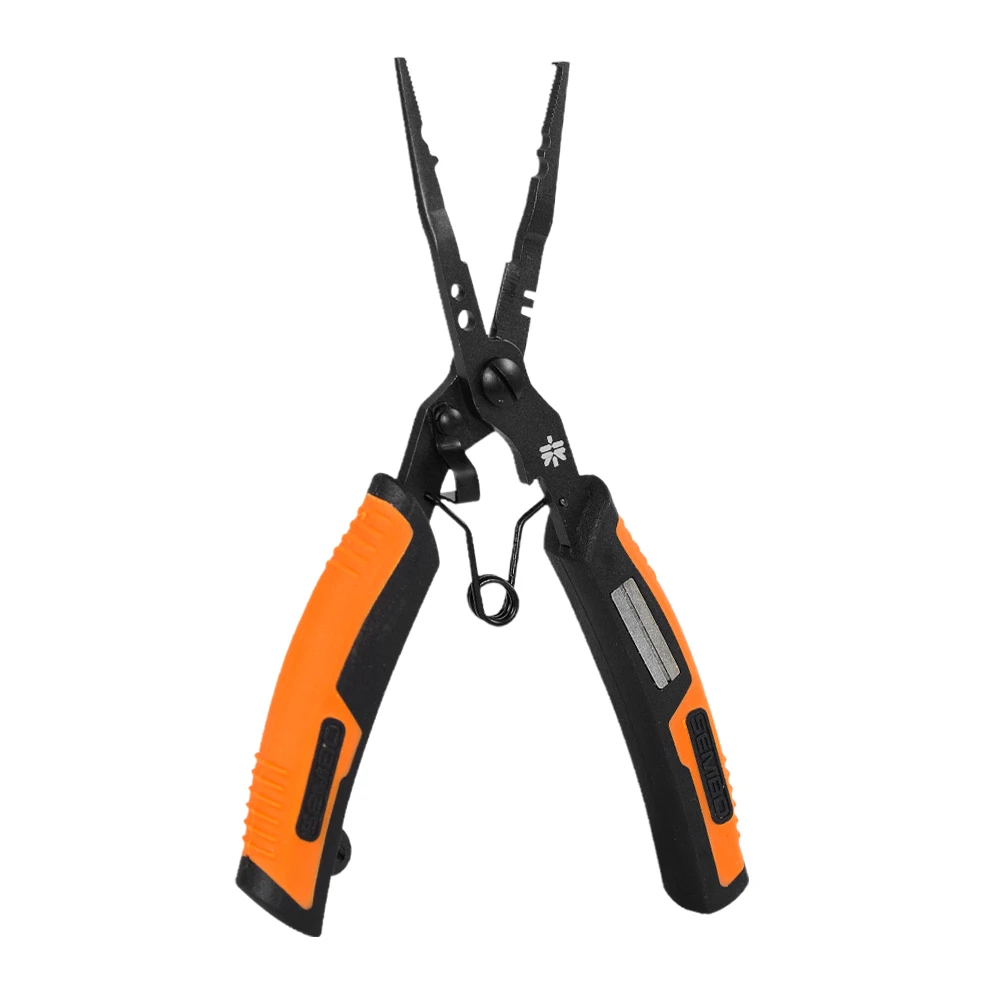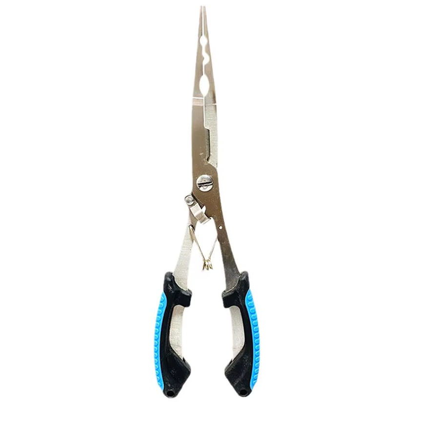 Многофункциональные рыболовные плоскогубцы выполнены из нержавеющей стали с накладками из ABS-пластика, имеют длину около 12,5 см и вес 52 г, комплектуются страховочным шнуром длиной 22 см. Конструкция включает узкий зубчатый нос для извлечения крючков, встроенные режущие кромки для лески, зону для обжима грузил, пружинный механизм раскрытия губок и фиксатор для хранения в закрытом состоянии. Предусмотрено несколько цветовых вариантов корпуса и шнура, что упрощает визуальное различие инструмента в снаряжении.
