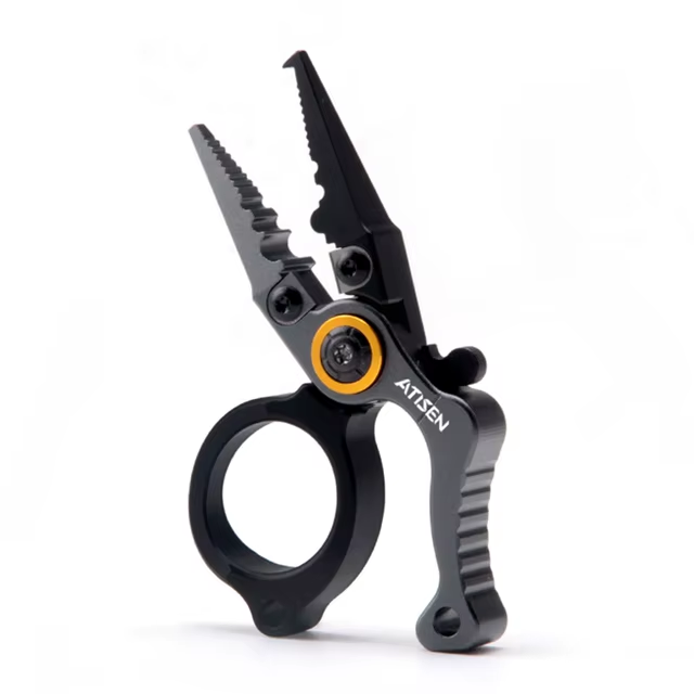 Это уже максимально компактный формат, длина около 9 см и вес порядка 28 граммов. По конструкции они ближе не к классическим пассатижам, а к мини-инструменту с кольцевым хватом под палец. Корпус из алюминиевого сплава, режущая часть отдельная, с твердосплавными вставками, есть насечки на губках, зона для обжима грузил, прорезь под леску и элемент для работы с заводными кольцами. Присутствует фиксатор в закрытом положении и отверстие под страховочный шнур. Если сравнивать с предыдущими алюминиевыми плоскогубцами на 18 см, разница сразу в масштабе: там полноценный инструмент с нормальным рычагом, здесь карманный вариант, который удобнее держать под рукой, но он не рассчитан на силовую работу. В сравнении с Booms Fishing F03, это еще более узкая специализация: у F03 длинные губки и больше функций для работы в сложных ситуациях, а ATISEN X1 делает упор на компактность и быстрый доступ.