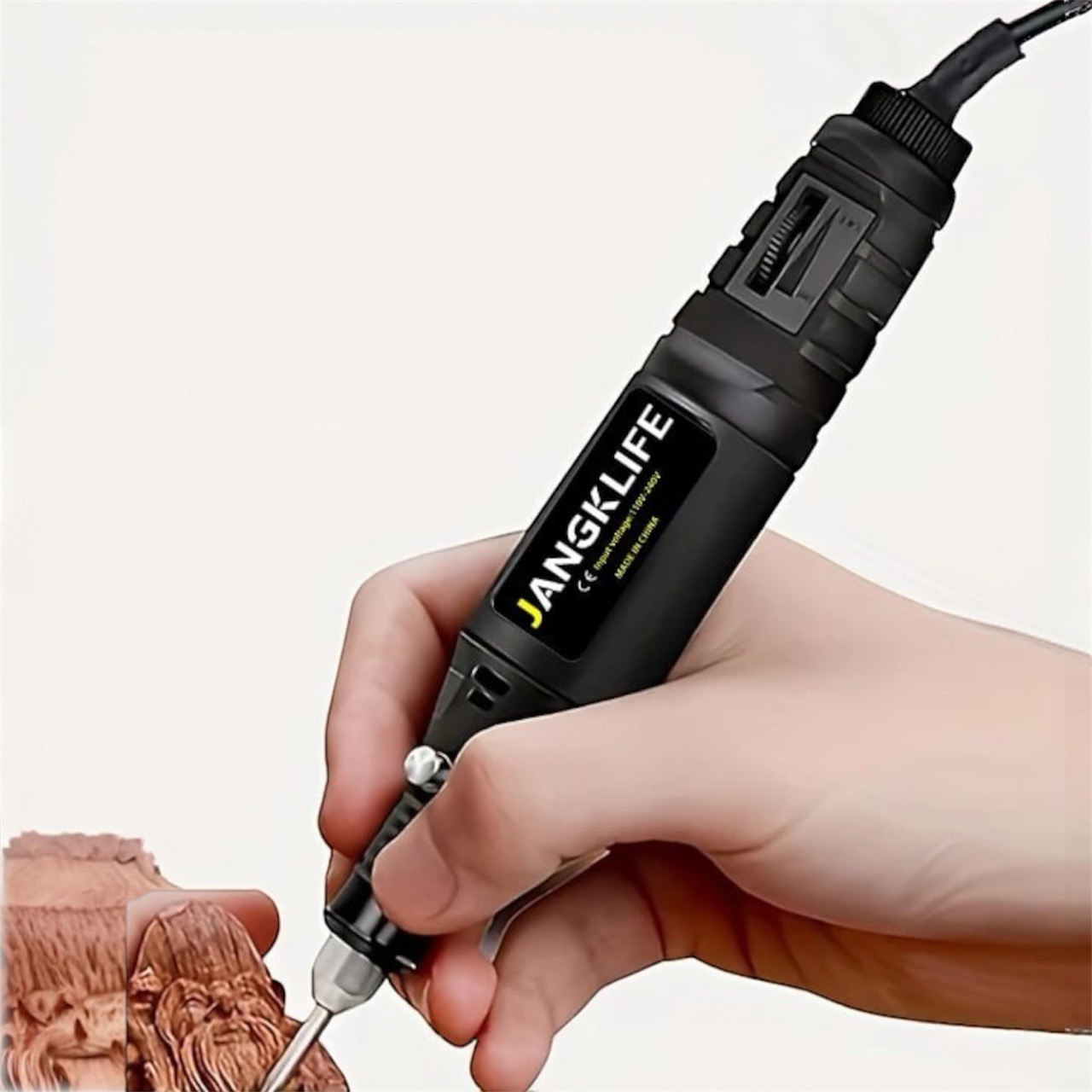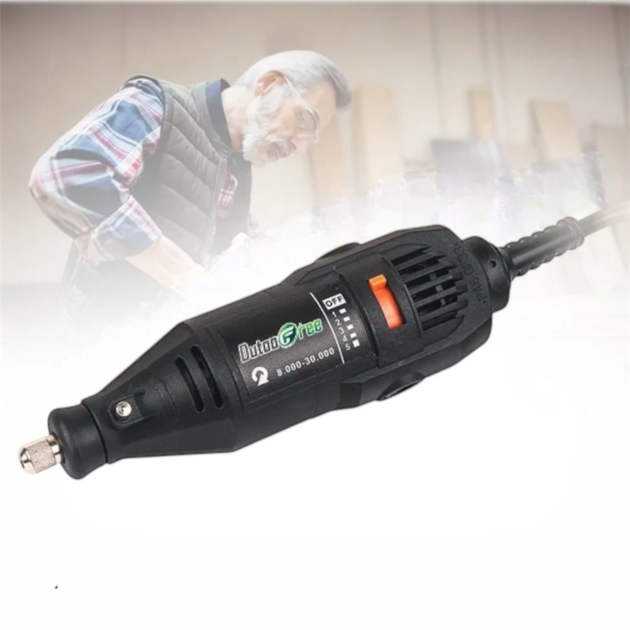 Сетевой инструмент повышенной мощности для домашних DIY-задач и мелких мастерских работ. Питание от сети 220 В, сертификация CE. Мощность до 260 Вт, скорость вращения регулируемая в диапазоне, примерно 5000 — 31 000 об/мин, предусмотрено 5 ступеней регулировки. Максимальный диаметр зажима 0,6 — 6,5 мм, что позволяет использовать более крупную оснастку. Вес около 0,65 кг, двигатель коллекторный. Подходит для гравировки, сверления, резки, шлифовки, полировки и заточки. Работает с деревом, металлом, пластиком, керамикой, стеклом и платами. Аккумулятора нет, вилка EU. В зависимости от версии комплект может включать гибкий вал и большой набор аксессуаров.