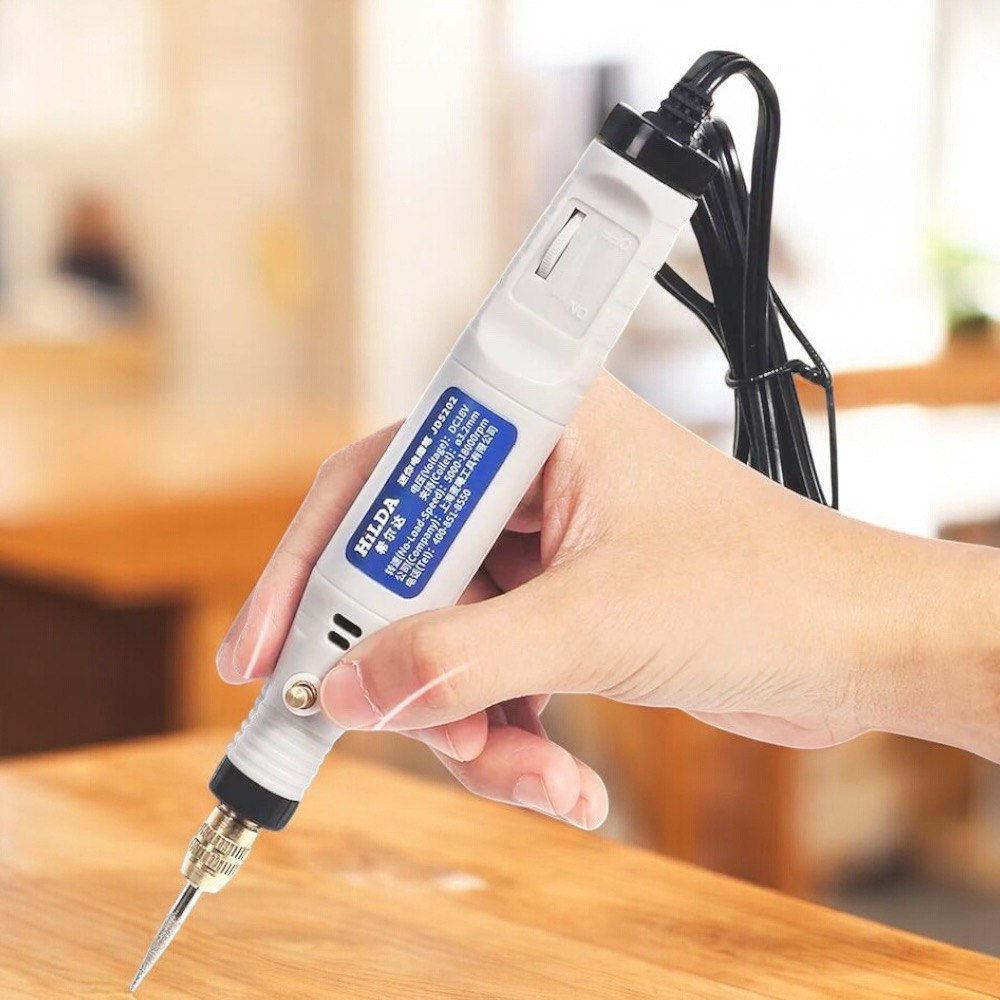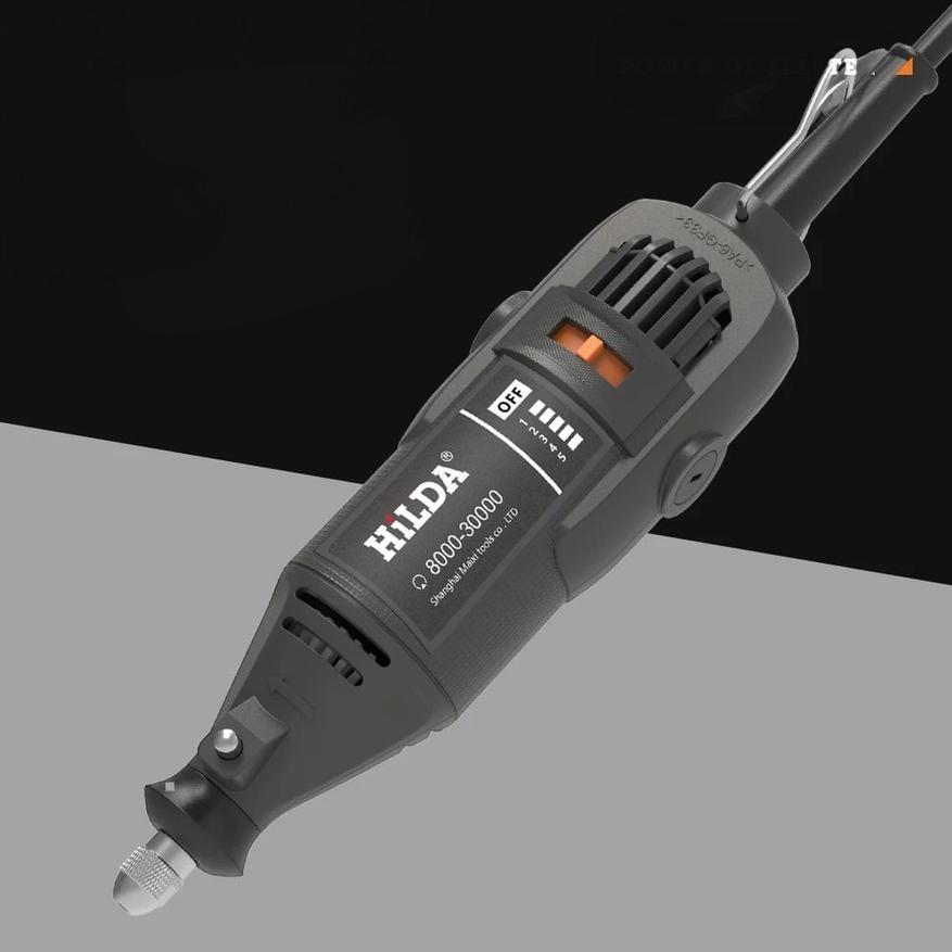 Ручной формат, питание от сети 220 В, аккумулятор не предусмотрен. Предназначена для гравировки, шлифовки, зачистки, заточки, резки тонких материалов и обработки дерева и пластика. Максимальный диаметр сверления до 3,2 мм. Стандартная вилка EU. В продаже три версии: HILDA 130 Вт — базовая модель для шлифовки и простых DIY-задач; HILDA 200 Вт — компактная мини-дрель для гравировки, резки и шлифовки; HILDA 400 Вт — самая мощная версия для интенсивных работ и использования с широкой оснасткой.