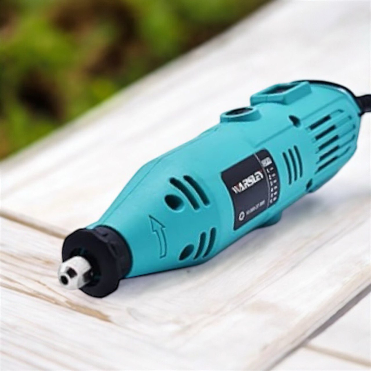 Более мощная и производительная модель по сравнению с предыдущей. Инструмент рассчитан не только на бытовые, но и на полупрофессиональные и коммерческие задачи. Питание от сети 220 В, сертификация CE, вес около 1,1 кг. Мощность составляет 480 Вт против 130 — 400 Вт у HILDA. Скорость вращения регулируемая, от 5000 до 30 000 об/мин, предусмотрено 6 скоростных режимов. Максимальный диаметр зажима до 6 — 6,5 мм, что заметно расширяет выбор оснастки и позволяет работать с более крупными насадками. Максимальный диаметр сверления до 6 мм. По назначению WG001 перекрывает те же операции, что и HILDA: гравировка, шлифовка, резка, заточка, очистка, но дополнительно ориентирована на работу с металлом, керамикой и более плотными материалами. Подходит для деревообработки, ювелирных работ и мелкого производства. Длина сетевого кабеля 1,5 м, аккумулятора нет.