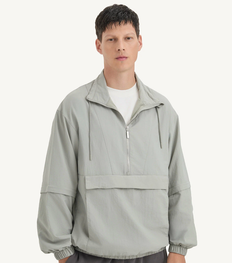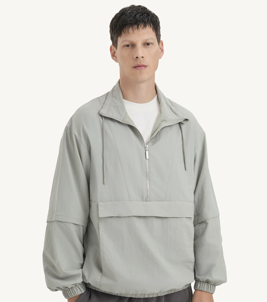 У куртки есть высокий воротник-стойка, объёмный карман-кенгуру с клапаном и удобная молния сбоку для лёгкого надевания. Отстёгивающиеся рукава позволяют трансформировать куртку в жилет — удобно подстраивать под температуру и стиль.