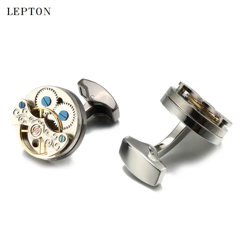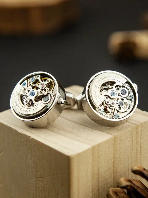 Вторая большая категория тематических часовых запонок — запонки в виде калибра. Здесь преобладают аксессуары круглой формы, по понятным причинам, а сам дизайн — по сути мелкие механизмы.