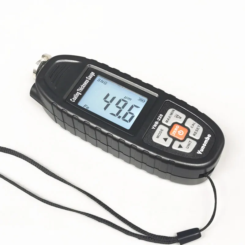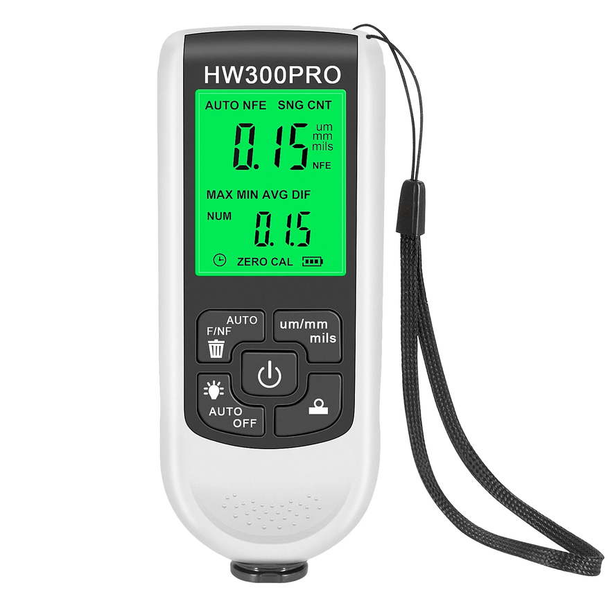Для быстрой проверки автомобильной краски по железу и алюминию. Технические характеристики: 0-1800 мкм, разрешение 50 мкм, погрешность +/-100 мкм, есть автоматическое распознавание Fe и nFe, включая оцинкованную сталь. Оснащен зеленой подсветкой дисплея, работает от двух батареек CR2032, которые в комплект не входят. Минимальная толщина основания 0,5 мм, минимальный диаметр поверхности 50 мм. Подходит для первичной оценки перекраса, но не рассчитан на работу с нержавеющей сталью.