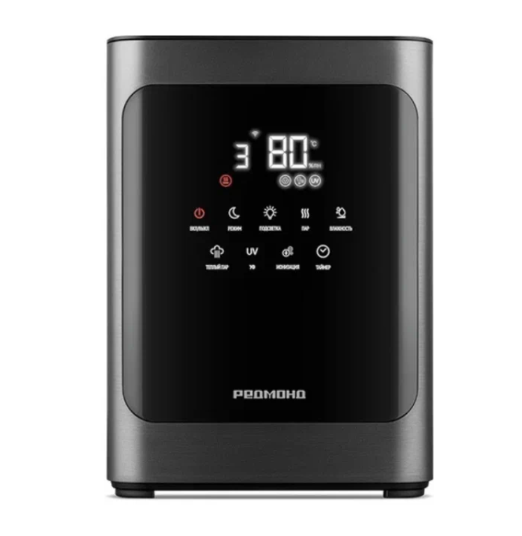 Система Smart-контроля поддерживает влажность в заданных пределах — от 40 % до 90 %. Можно выбрать один из семи уровней интенсивности, активировать авторежим. Расход 350 мл/ч.