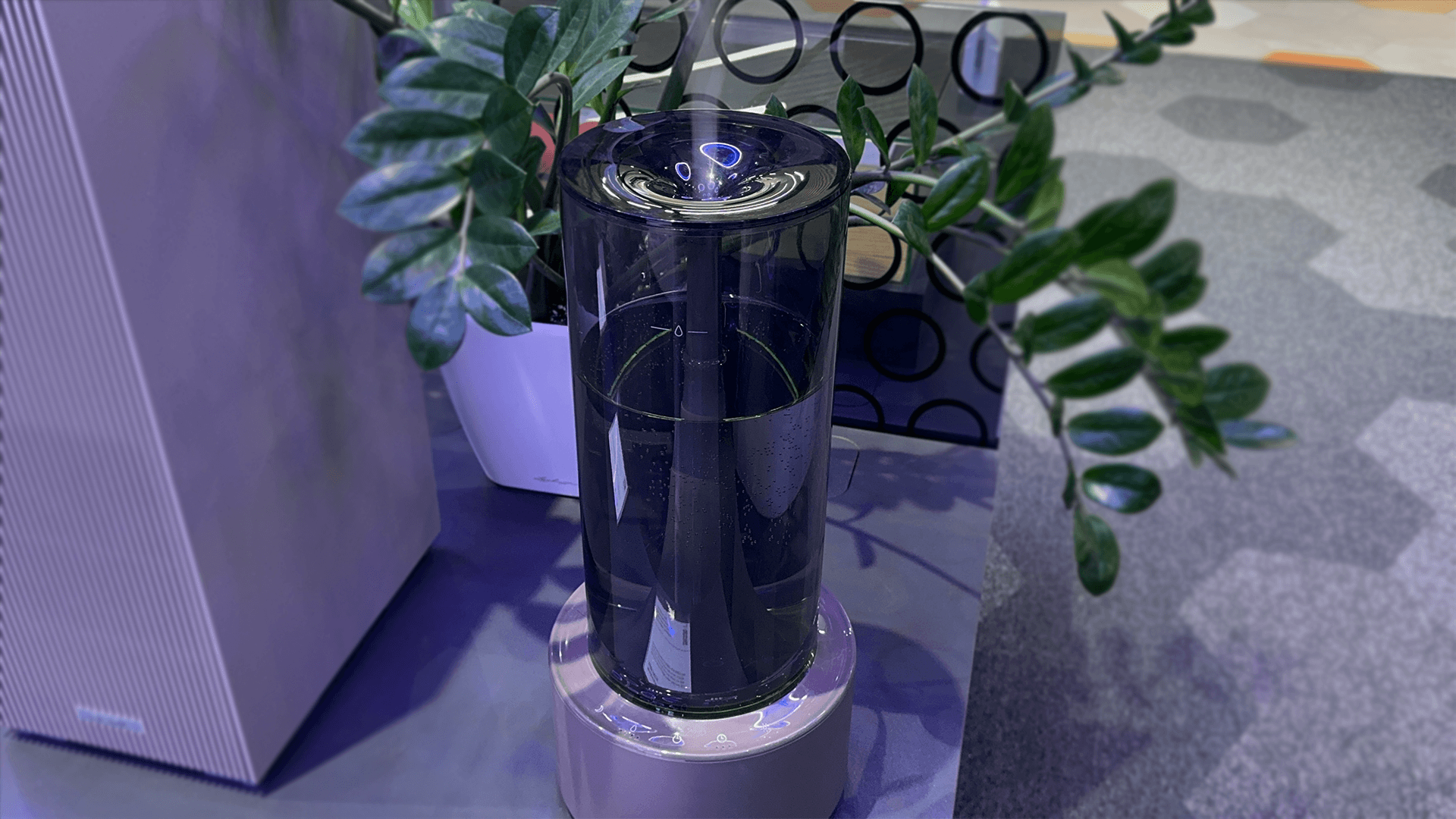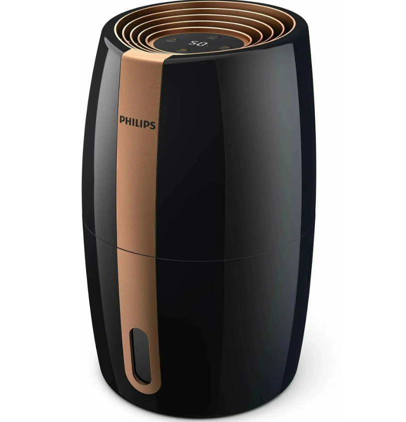 Модель компактная — 47 на 21 сантиметр. Мягкая подсветка показывает уровень влажности и помогает использовать прибор даже в темноте. Дизайн удостоен международных наград RedDot Design Award и Good Design Award.