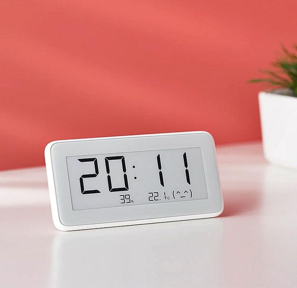 Развитием идеи предыдущего варианта термометра, являются часы с E-Ink дисплеем, которые отображают не только температуру и влажность в помещении, но и время. Часы можно использовать как в настольном варианте с подставкой из комплекта, так и закрепить вертикально, используя магнит. Девайс взаимодействует с приложением Mi Home по Bluetooth, время также устанавливается со смартфона. Питание от батареек CR2032. Отличный вариант подарка.