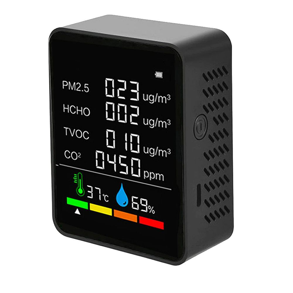Завершу подборку крутым цифровым тестером окружающей среды, который помимо температуры и влажности измеряет еще четыре дополнительных параметра качества воздуха: наличие твердых частиц пыли (PM2.5), содержание углекислого газа (CO2), присутствие летучих органических соединений (TVOC) и формальдегида (HCHO). Все это помещается в компактном корпусе с контрастным дисплеем, Устройство имеет встроенный аккумулятор 1200мАч.