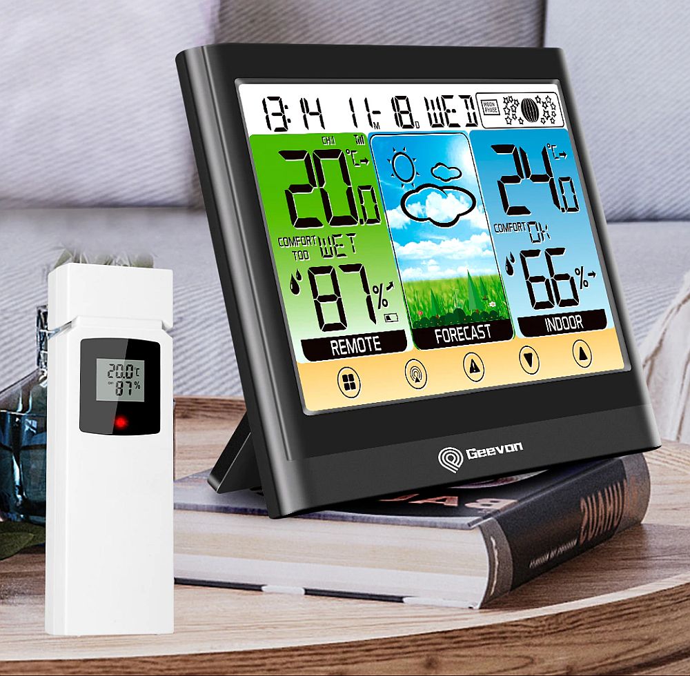 Весьма удачная модель с хорошим набором функций, вышедшая совсем недавно. Оснащена большим LCD дисплеем с диагональю 9.5 см, на который выводится достаточно большое количество информации. Показывается температура и влажность в помещении, время и текущая дата, а кроме этого, есть цветовая полоска с указателем насколько окружающая среда комфортна, а также минимальное и максимальное значение измеренных показаний за последние сутки. Более того, устройство оснащено сенсорной кнопкой подсветки, удобно использовать в темном помещении или вечером. Несколько вариантов крепления.