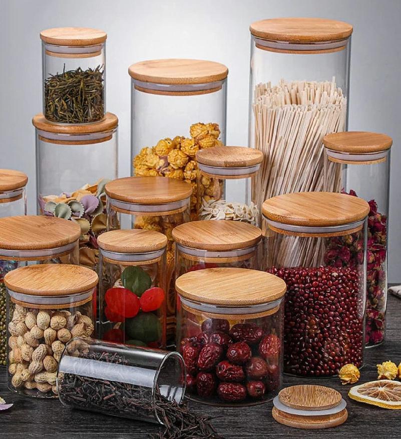 Еще один популярный вариант для хранения с большим количеством положительных отзывов — контейнеры, выполненные в виде стеклянных банок. На странице товара около двадцати разных вариантов емкостей по высоте и объему от 100 до 1450мл. Все баночки изготовлены из бамбука и комплектуются крышкой с силиконовым уплотнителем. Подойдут для хранения не только сыпучих, но и других продуктов: специй, орехов, сухофруктов