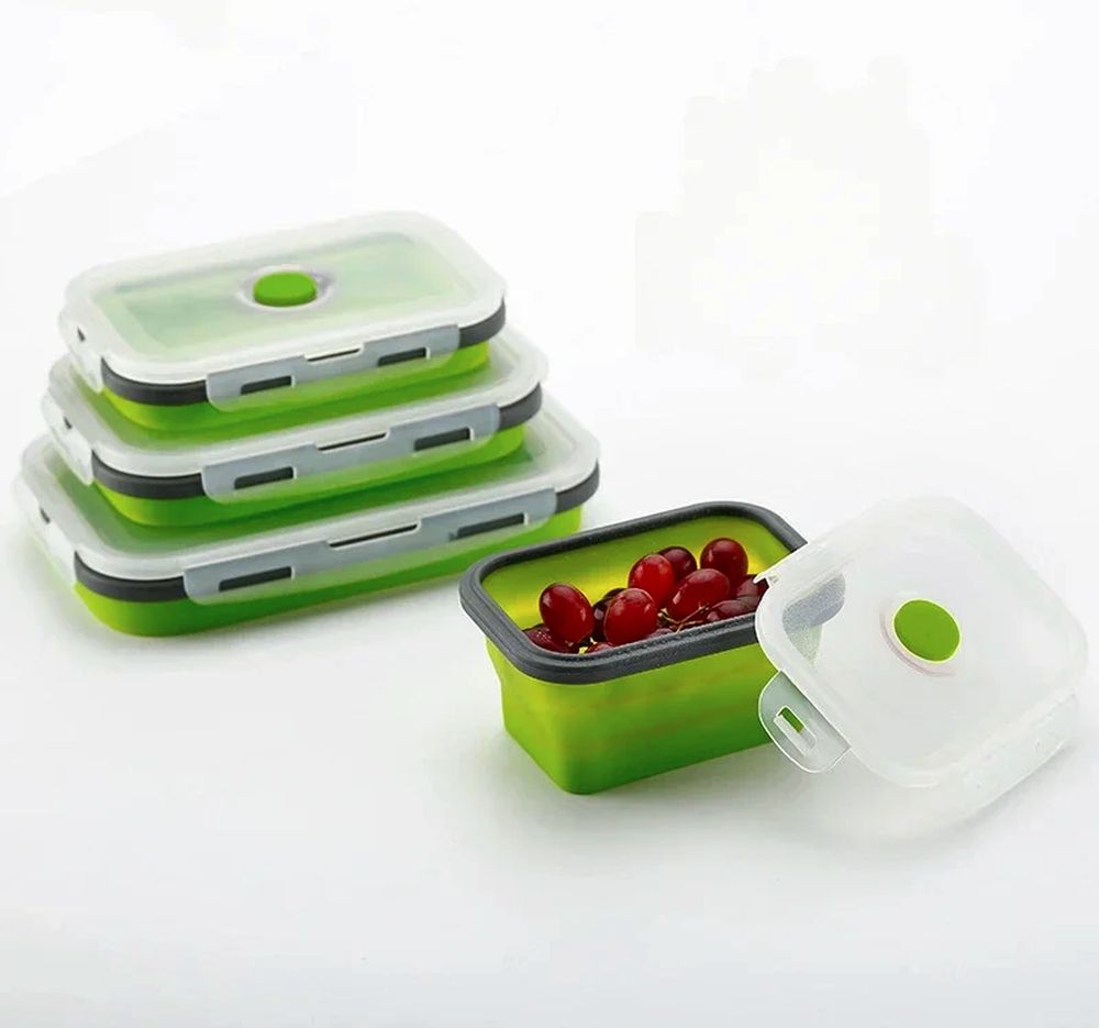 Практичные складные силиконовые контейнеры, которые в сложенном виде, когда они не используются, почти не занимают места. Продаются по одной штуке или наборе из четырех штук. На странице товара есть шесть различных вариантов расцветки расцветки контейнеров. Объем емкостей разный: от 350 до 1200мл (в разложенном состоянии). Отлично подойдут и в качестве ланч-бокса, который можно взять с собой.