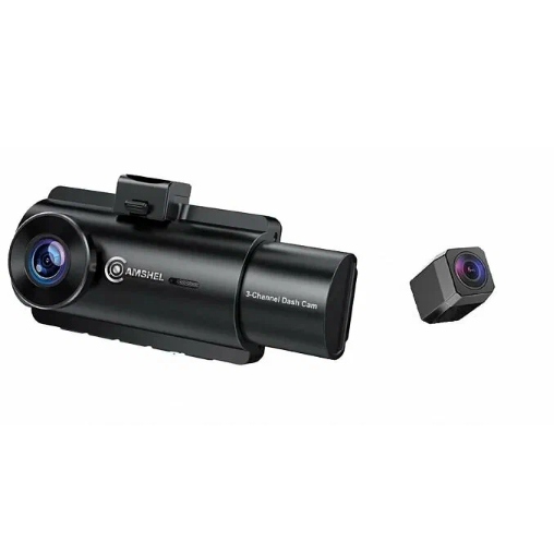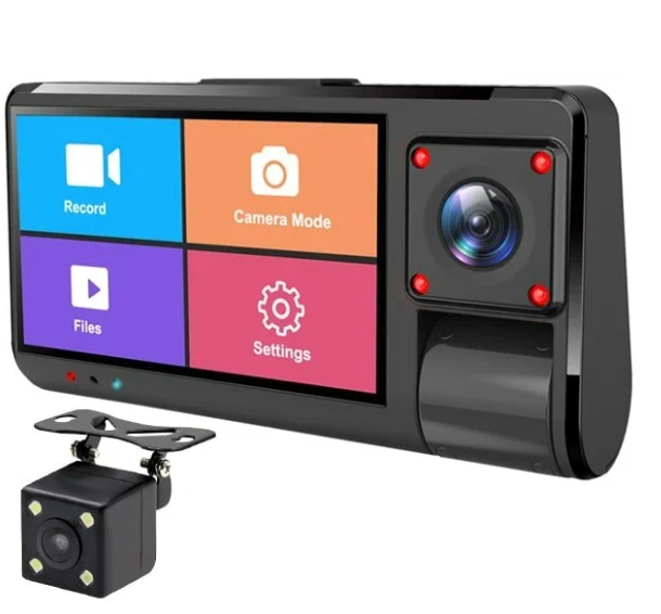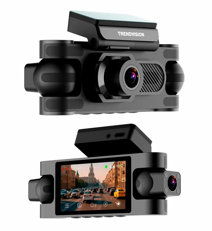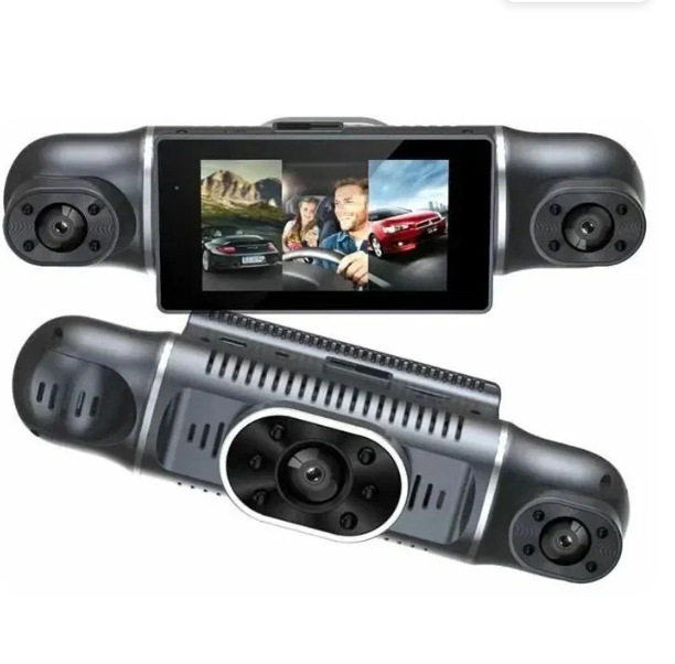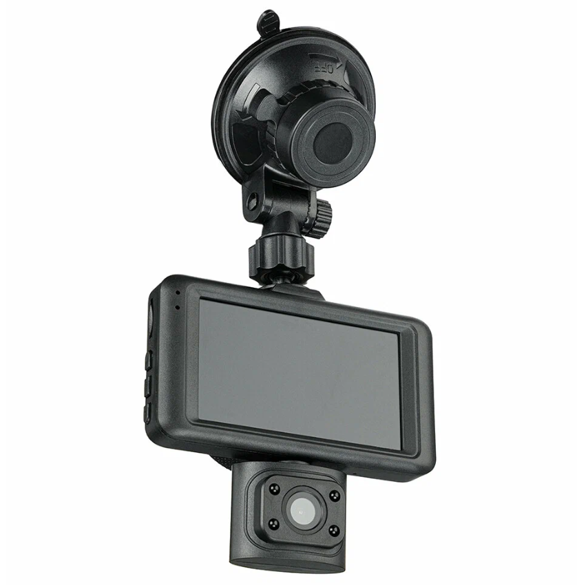 Регистратор с тремя встроенными камерами (фронтальная плюс две боковые салонные) и ещё с камерой заднего вида (выносной). Все встроенные камеры обладают ИК-подсветкой от светодиодов. Боковые камеры поворотные. Выносная камера с функцией парковочного ассистента.