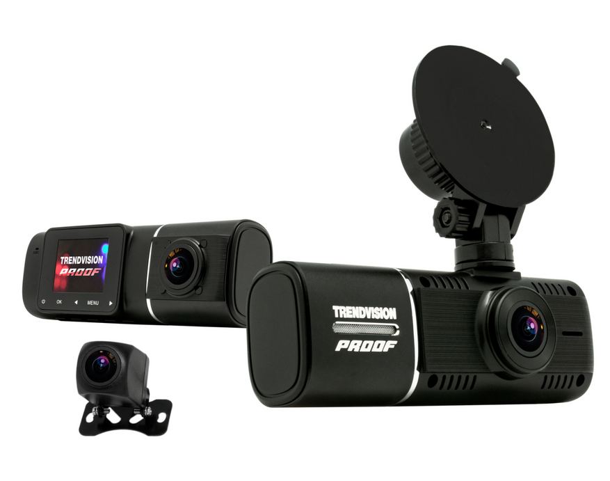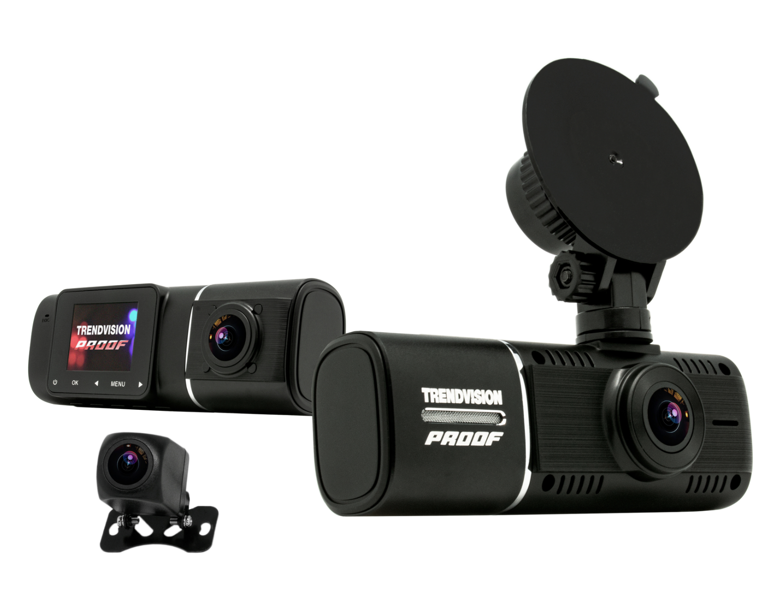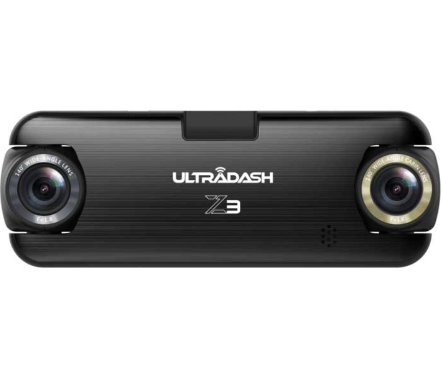 У этой модели три камеры, которые записывают происходящее внутри и снаружи автомобиля. Две из них встроены в корпус: одна направлена вперёд, вторая — в салон. Передняя камера снимает в FullHD, салонная — в HD и может поворачиваться на угол до 250°. Её дополняют четыре светодиода — они помогают вести съёмку даже при слабом освещении.