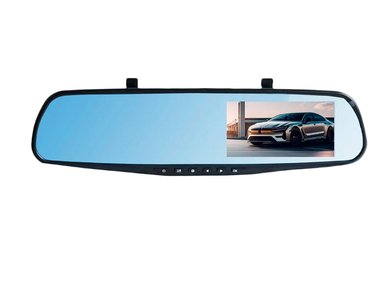 Диагональ дисплея — 4,3 дюйма. При выключенном режиме экран не мешает, зеркало используется как обычное.