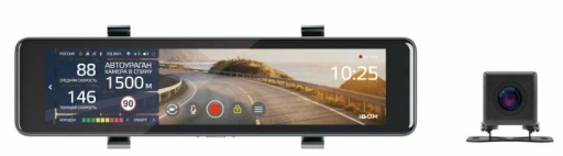 Это зеркало-видеорегистратор пишет в Full HD/HD (основная/задняя) камеры. Он обладает сенсорным дисплеем восемь дюймов. Углы обзора камер 170° - передняя и 120° - задняя. Доступен вывод изображений с двух камер сразу. Задняя камера может служить ассистентом при парковке.