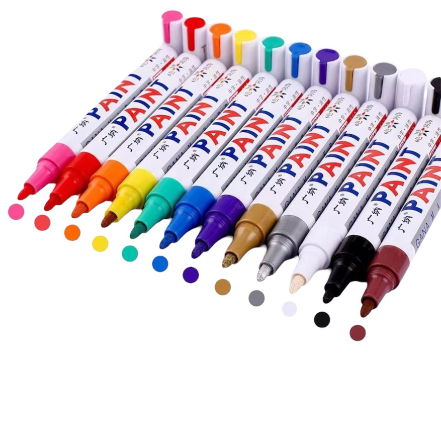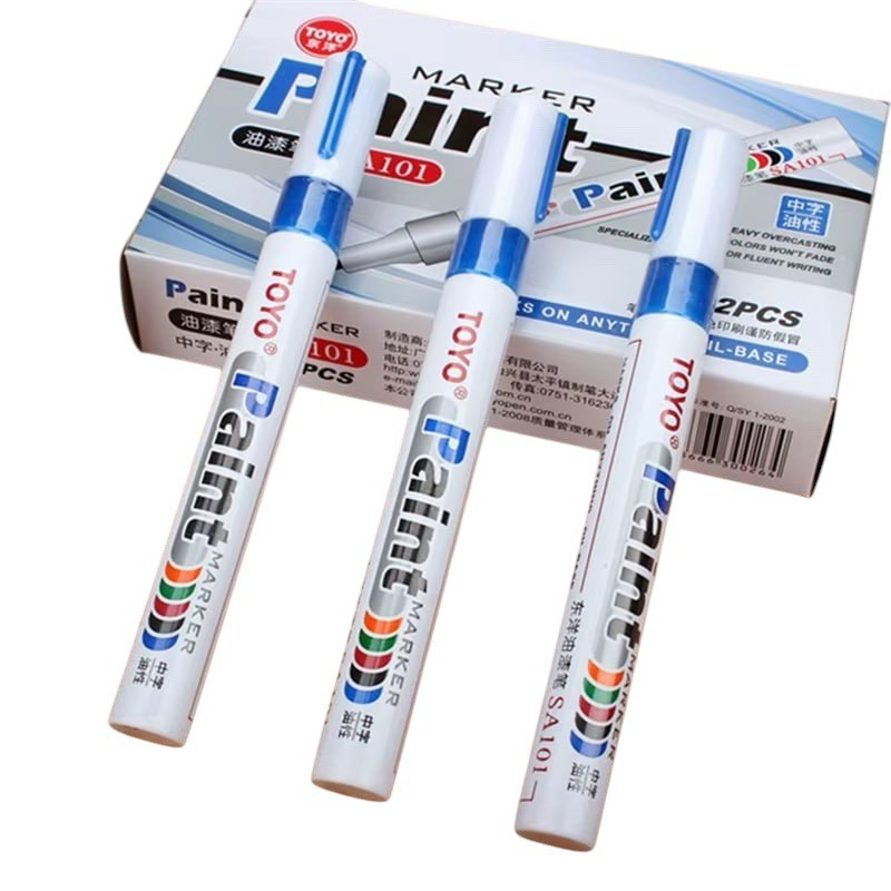 Масляный перманентный маркер SA101 предназначен для нанесения стойкой разметки на резину, металл, стекло, пластик, дерево и другие материалы. Часто используется для маркировки автомобильных и мотоциклетных шин, включая окраску выступающих букв и нанесение отметок на гоночные шины. Чернила водостойкие, подходят для наружного применения. Толщина линии письма — 2,2-2,8 мм, наконечник круглый. Размер ручки — 14,3x1,5 см. Перед использованием маркер необходимо встряхнуть и активировать нажатием на наконечник. Один цвет в упаковке.