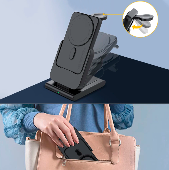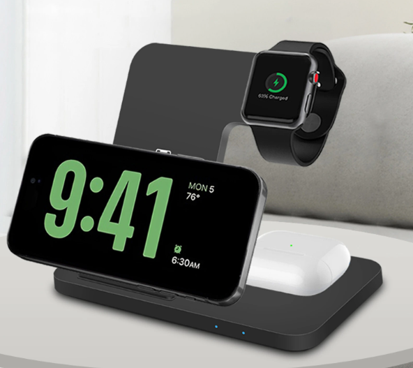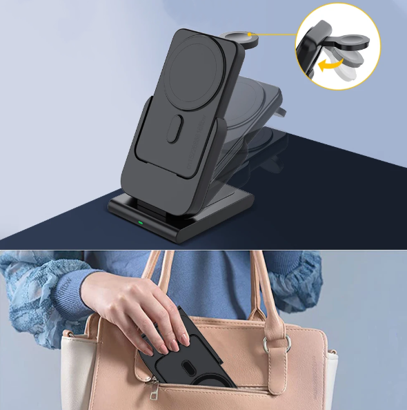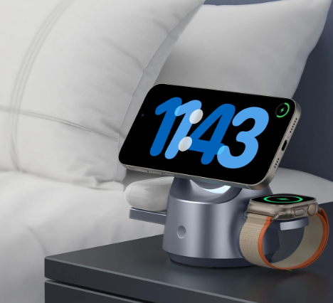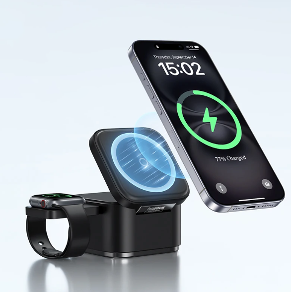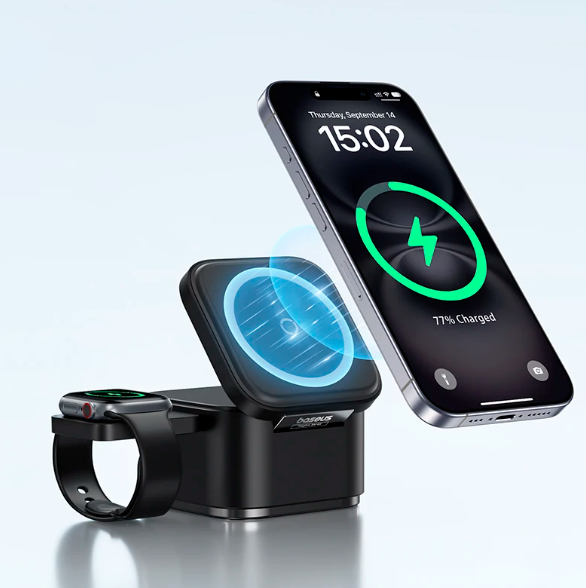 Устройство поддерживает беспроводную зарядку мощностью до 15 Вт для всей экосистемы Apple. Встроенная светодиодная подсветка добавляет эстетики, а складная конструкция делает станцию удобной для хранения и перевозки.