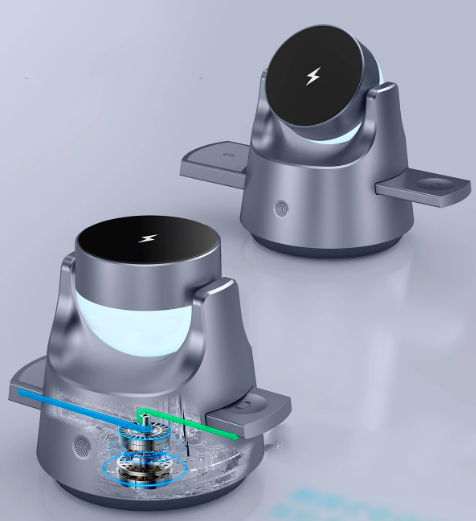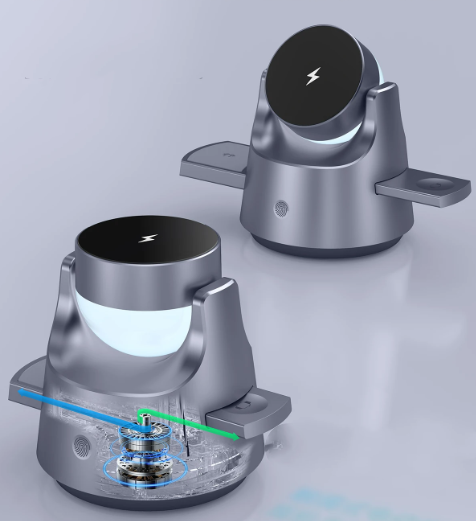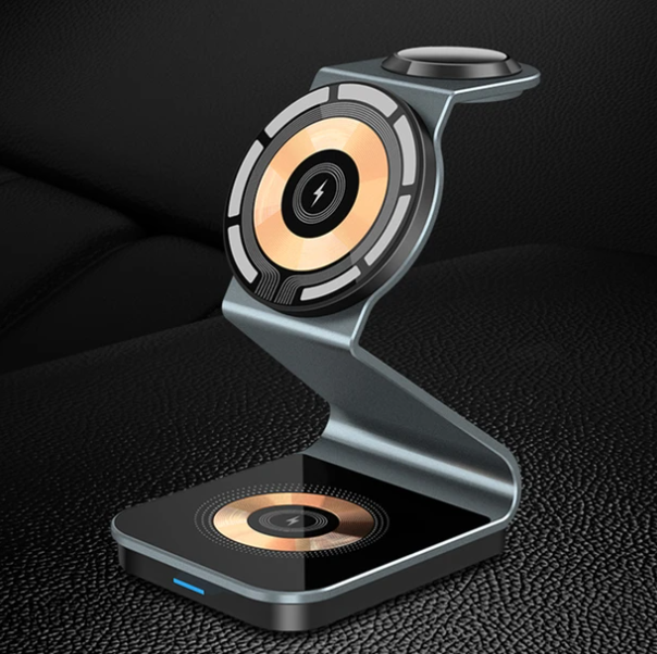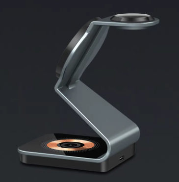 Док станция ILEPO — настоящее воплощение современных технологий и футуристического дизайна. Её отличительная особенность — моторизированный привод: боковые зарядные платформы для Apple Watch и наушников автоматически выезжают по нажатию сенсорной кнопки. Основная магнитная часть для iPhone может регулировать угол наклона до 120 градусов, что обеспечивает максимальный комфорт.