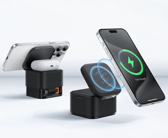 Этот гаджет — больше, чем просто беспроводная док-станция. Он представляет собой гибрид стационарной зарядки и портативной батареи ёмкостью 5000 мАч, что делает его интересным решением как для дома, так и для путешествий.