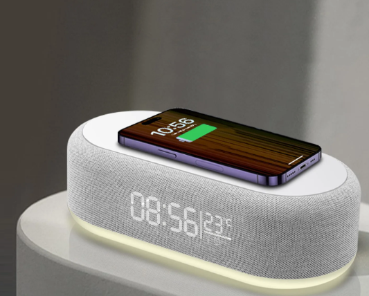 Это многофункциональное устройство отлично подойдёт для прикроватной тумбочки, так как совмещает в себе мощную беспроводную зарядку, цифровой будильник и термометр. Просто положите телефон на его поверхность — и он начнёт заряжаться мощностью до 15 Вт, причём даже в чехле.