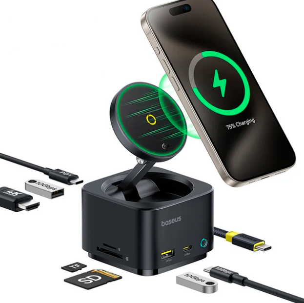 Последняя в подборке универсальная док-станция — идеальное решение, объединяющее в себе мощную магнитную беспроводную зарядку и функциональный USB-C хаба. Она позволит не только эффективно зарядить гаджеты, но и расширить возможности вашего ноутбука. Вы можете легко зарядить телефон мощностью до 15 Вт по стандарту Qi2, установив его на подставку под удобным углом. При этом мощный порт PD на 100 Вт обеспечит питанием ваш ноутбук.