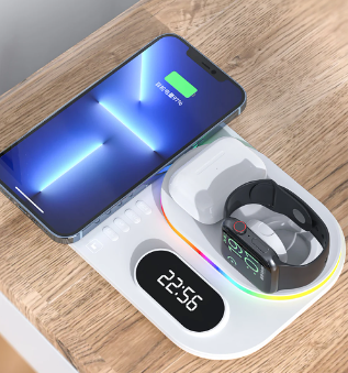 Это устройство — не просто беспроводная зарядка, а универсальный гаджет для вашего рабочего стола. Оно выделяется среди аналогов пиковой выходной мощностью в 30 Вт, встроенной светодиодной подсветкой и электронными часами. Яркость подсветки настраиваемая.