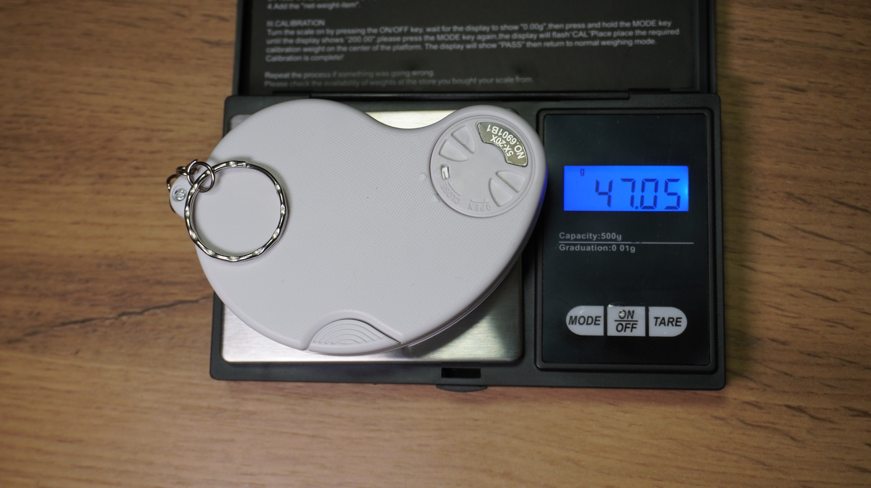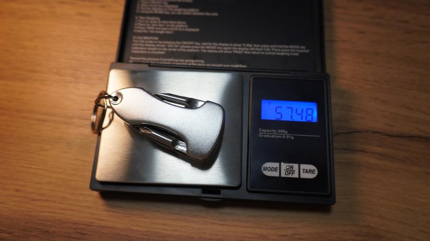 Сам брелок компактный, запросто помещается в карман. Но стоит сказать, что тяжелый. На снимке ниже можете увидеть его вес.