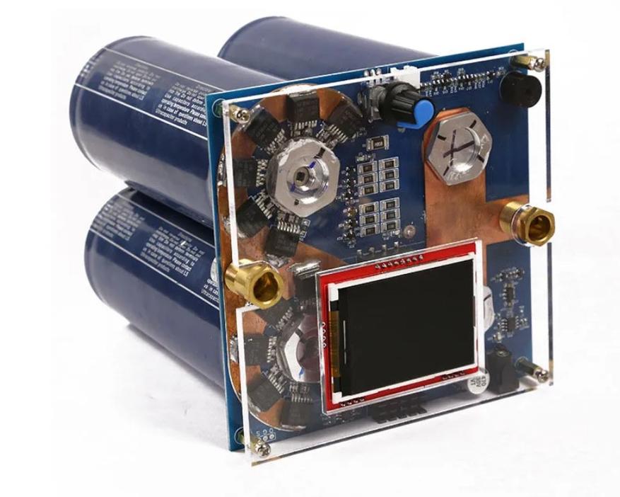 Количество циклов заряд-разряд 1 миллион. На лицевой стороне расположен цветной дисплей, единственный орган управления — энкодер, и латунные 9-миллиметровые сварочные разъемы (байонеты) для подключения силовых проводов. Плата закрыта акриловым стеклом.