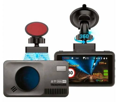 Кронштейны имеются двух видов: на присоске, со скотчем 3M. Крепление магнитное. Продуман поворот на 180°, чтобы снимать с различного ракурса (может понадобиться при общении с инспекторами).