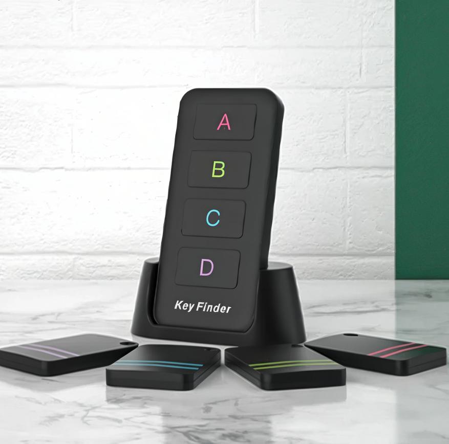 Если концепция трекеров с пультом вам понравилась, но цена кусается, обратите внимание на более бюджетный вариант. Этот комплект представляет собой полный функциональный аналог предыдущего решения, но с некоторыми отличиями, которые позволили снизить стоимость. В набор входят четыре трекера прямоугольной формы и один пульт управления. Принцип работы остаётся прежним: нажимаете кнопку на пульте, соответствующий маячок активируется и издаёт звуковой сигнал.