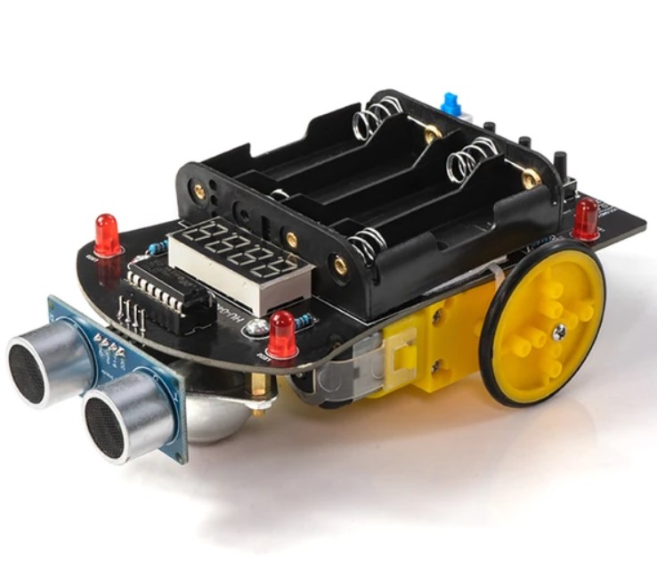 С помощью этого комплекта начального уровня для самостоятельной сборки робота вы сможете создать простого робота, напоминающего по функциям робота-пылесоса, который будет способен выполнять простые задачи, например, перемещение вдоль линии, уклонение от столкновения, объезд препятствий, выбор оптимального пути и другие варианты. В комплекте небольшая платформа, отладочная плата, батарейный отсек, два колеса — управление и повороты осуществляются за счет комбинации команд на оба привода. Этот набор с ограниченным набором сенсоров — на борту два датчика УЗ и датчик черной линии на белом фоне, так что подойдет для обучения базовым алгоритмам робототехники, основам механики, а также для изучения принципов программирования.