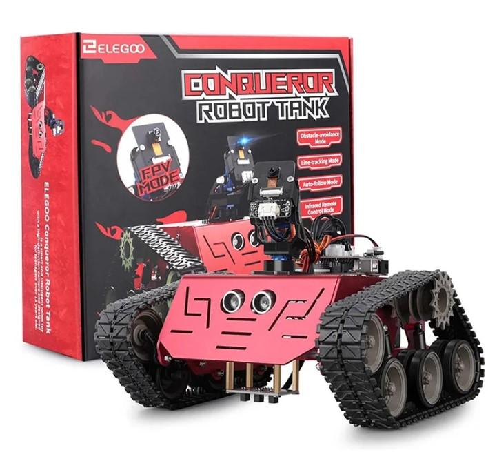 И в завершении данной подборки предлагаю посмотреть на необычный комплект для самостоятельной сборки. Речь идет про робот-танк Conqueror в полностью металлическом корпусе (сборные алюминиевые панели с лазерной резкой и разметкой отверстий) и на базе Anduino UNO R3. Набор от ELEGOO предлагает возможность создать умного робота на гусеничной платформе с возможностью распознавания объектов с помощью встроенной камеры. Это отличный выбор для тех, кто хочет погрузиться в мир компьютерного зрения и исследовать возможности автоматизации. Такой робот подойдет как для соревнований, так и для использования в качестве основы для более продвинутого робота. Обратите внимание, повышенную проходимость обеспечивает гусеничный привод на основе электрического редуктора и четырех катков с каждой стороны.