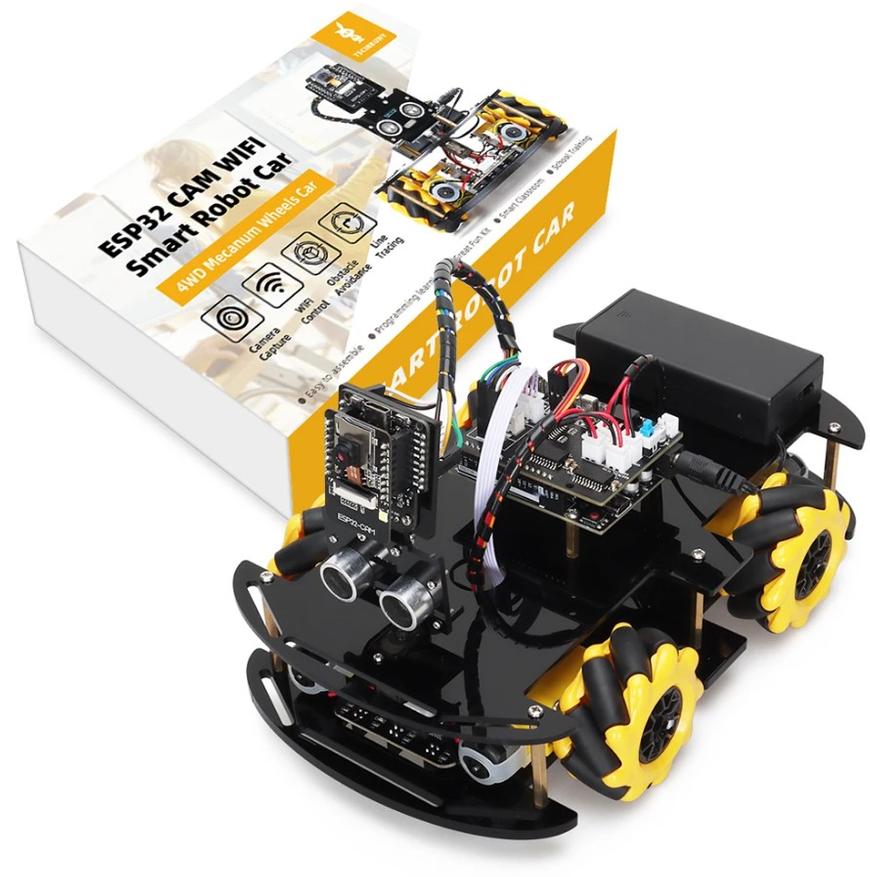 Начну подборку с набора на базе вебкамеры ESP32-Cam и с поддержкой WiFi подключения. Данный комплект идеально подходит для начинающих. Он включает в себя все необходимое для создания простого робота, который может двигаться, измерять расстояние и реагировать на контрастную линию для передвижения. Множество сенсоров в комплекте позволяют не только отслеживать показания, но и реализовывать алгоритмы управления и выбора пути. В магазине-интеграторе Top One Store стоимость практически на тысячу рублей дешевле, чем в оригинальном магазине разработчика. Доставка бесплатная. Обратите внимание — аккумуляторные батареи в комплект не входят.