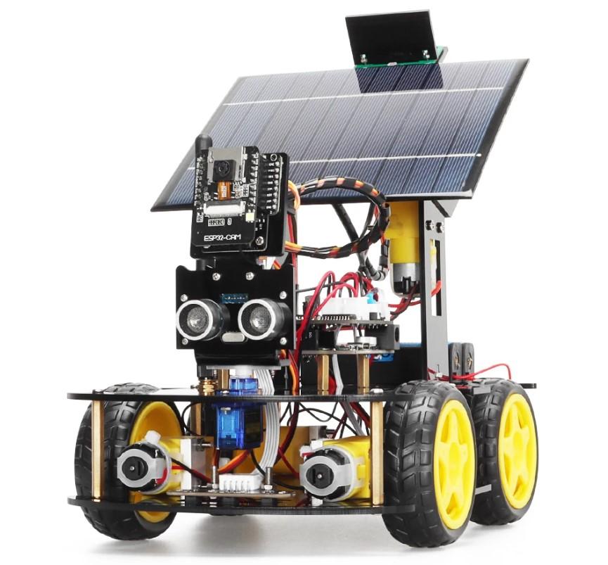 Этот набор предлагает возможность создать автомобильного робота, который может двигаться по заданному маршруту, избегать препятствий и даже записывать видео с помощью встроенной вебкамеры (на борту ESP32-Cam). Отличный выбор для тех, кто хочет погрузиться в мир автоматизации и управления движением. Модель в некотором роде похожа на предыдущий вариант, но базируется на другом типе шасси. В качестве монтажной платформы используются два уровня акриловых пластин. Оборудование (отладочная плата и шилды) размещается между пластин, часть сенсоров установлена таким образом, что позволяет контролировать расстояние до объектов на пути движения робота, а также отслеживать контрастную линию-трекер. Из особенностей отмечу широкий модуль солнечной батареи, предназначенной для резервного питания. Подобный робот подойдет для испытаний на улице, ведь солнечный свет будет непрерывно подзаряжать аккумуляторную батарею.
