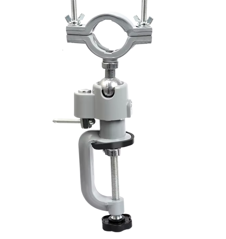 Крепится к столу за счет классической струбцины.