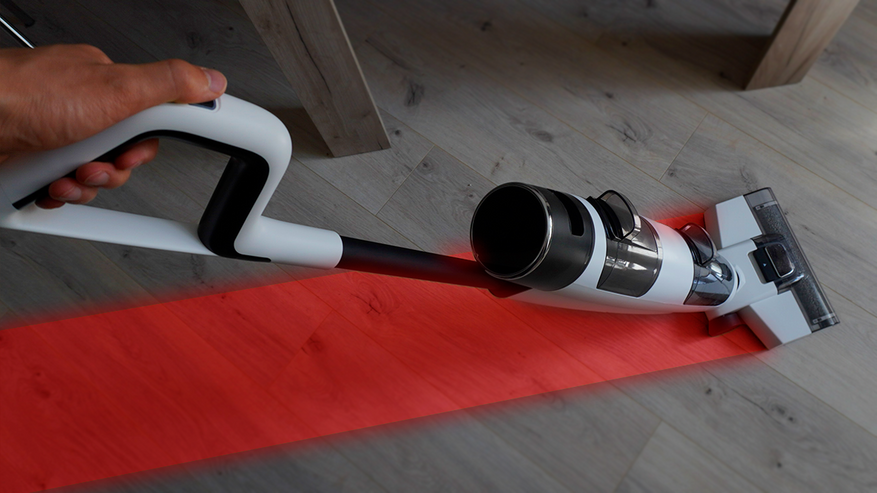 Прибор способен выполнять по отдельности сухую уборку и мыть пол. Слева у ролика присутствует небольшая слепая зона ввиду конструкции. При сухой уборке для чистки ковров прибор подходит. Объём пылесборника (он же контейнер для грязной воды) у него 550 мл. Ёмкость для чистой воды на 680 мл. При влажной уборке предусмотрена автоподача жидкости на ролик, что позволяет избежать луж. Пылесос обладает всасывающей мощностью 6000 Па, что позволяет эффективно собирать как сухой мусор, так и жидкости.