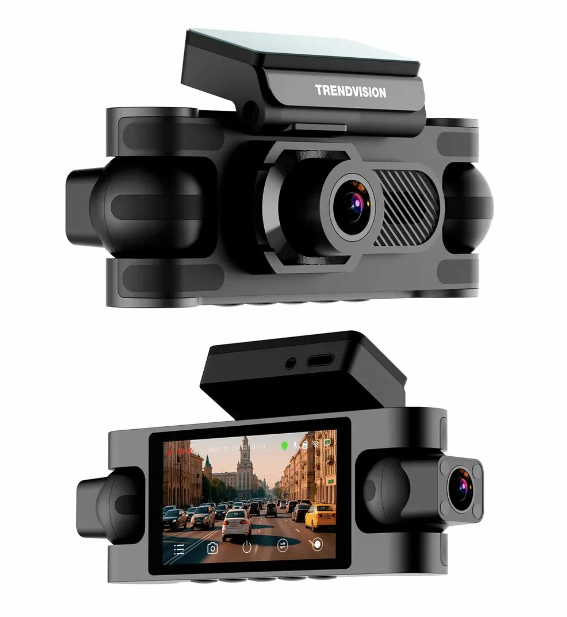 В этой модели установлены 3 камеры в самом устройстве и 1 задняя, которую подключают отдельно. Передняя камера расположена стандартно, две салонные — по боковым сторонам. Они поворачиваются на 180°, так что фиксируется всё, что происходит внутри и вокруг автомобиля. У боковых камер по четыре инфракрасных светодиода — это помогает снимать в темноте, когда освещение слабое или его нет вовсе.