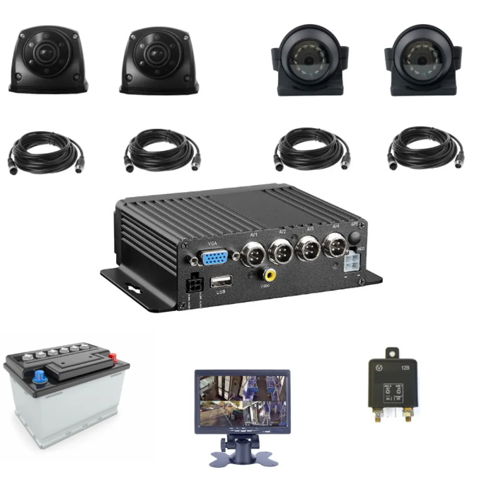 Работают камеры в разрешении FullHD. В наборе идут видеорегистратор, монитор, четыре камеры (под них удлинители предусмотрены), аккумулятор, развязка плюс карта памяти.