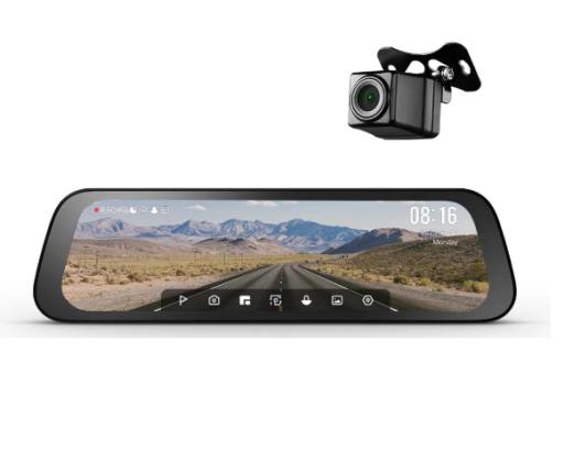 Двухкамерный видеорегистратор-зеркало с выдвижной площадкой, на которой находится объектив. Угол обзора — 138° (охват своей полосы и соседних рядом). В устройстве присутствует Wi-Fi, благодаря чему можно управлять зеркалом через смартфон. Управлять можно и через сенсорный дисплей, который впечатляет размером — 9,35 дюйма.