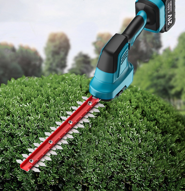 Модель оснащена лезвиями из стали SK5 и работает от аккумулятора. Конструкция позволяет выполнять обрезку травы, мелких кустарников и живой изгороди. Предусмотрена система двойного действия лезвий, что ускоряет рабочий процесс. Благодаря отсутствию проводов, инструмент можно использовать в удалённых зонах участка.